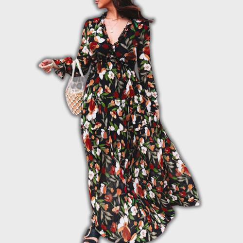 Perfekt för både fritid och eleganta tillfällen, imponerar denna maxiklänning med blommönster genom sin iögonfallande V-ringning och långa ärmar som förenar komfort och elegans.